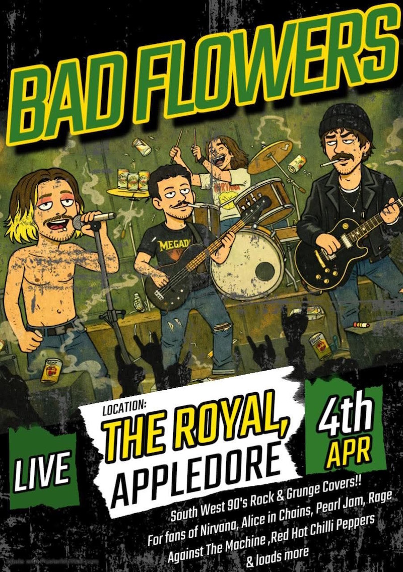 Bad Flowers do rock covers with a strong dose of 90’s grunge. If you enjoy Nirvana, Alice in Chains, Pearl Jam, Rage against the Machine or even the Red Hot Chilli Peppers (and we at Appledore Music do like the Chilli Peppers) you won’t be disappointed.